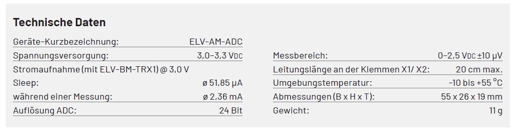 Das ELV-AM-ADC ist ein 24-Bit-Analog-Digital-Wandler als Applikationsmodul mit differenziellen Eingängen (AINP/AINN) und einer integrierten 2,5-V-Erregerspannung zur direkten Versorgung von Sensoren wie Wägezellen. Ziel ist die präzise, rauscharme Erfassung sehr kleiner analoger Spannungen, wie sie z. B. von Wägezellen, Drucksensoren oder einigen Temperatursensoren kommen.